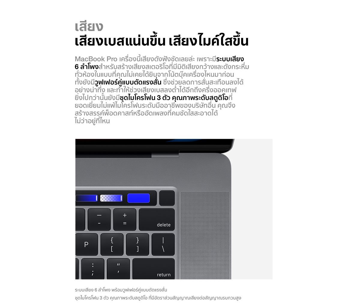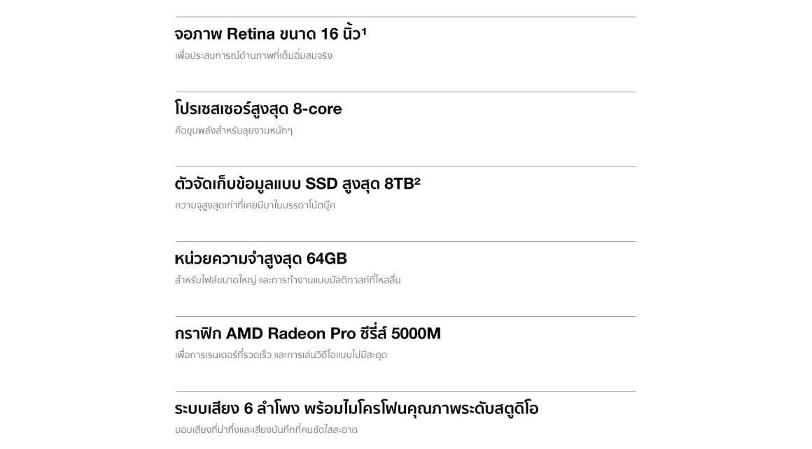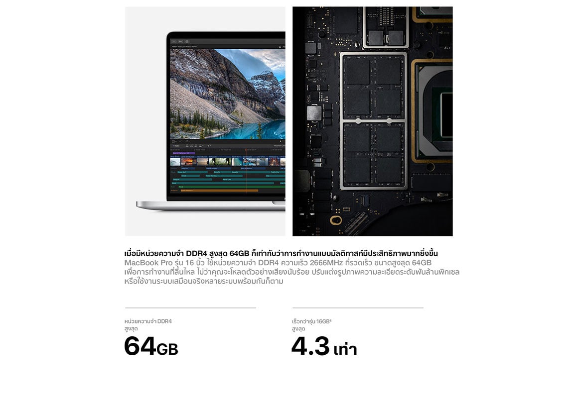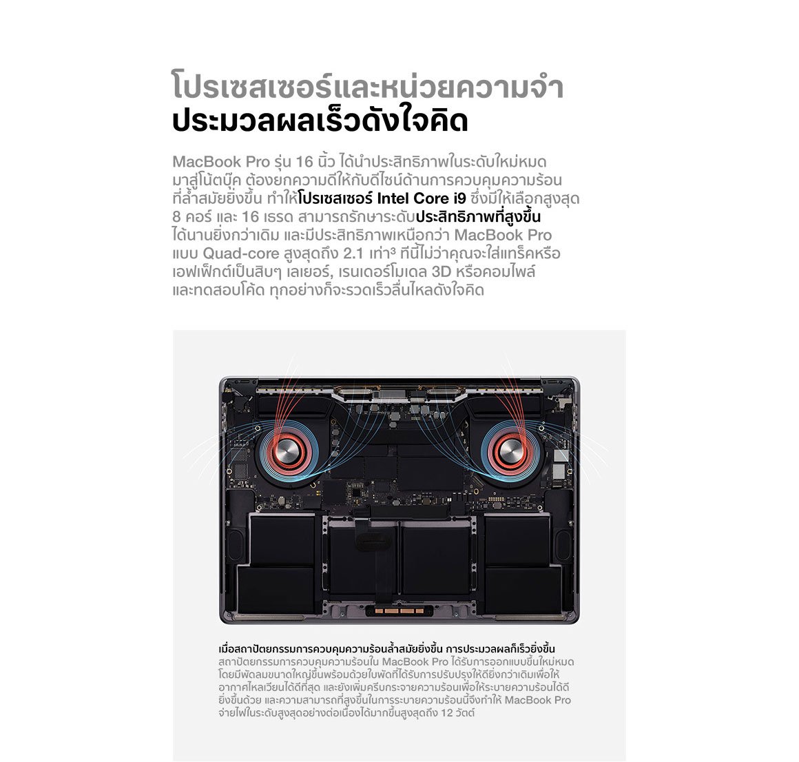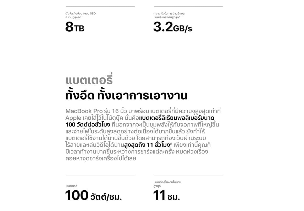 - Apple ทำการทดสอบในเดือนตุลาคม 2019 โดยใช้ระบบของ MacBook Pro 16 นิ้ว รุ่นก่อนการผลิตจริงที่มี Intel Core i9 แบบ 8-core ความเร็ว 2.3GHz พร้อม RAM ขนาด 16GB และ SSD ความจุ 1TB การทดสอบการท่องเว็บผ่านระบบไร้สายวัดระยะเวลาการใช้งานของแบตเตอรี่โดยการเข้าดูเว็บไซต์ซึ่งเป็นที่นิยม 25 ไซต์ผ่านระบบไร้สาย ขณะตั้งค่าความสว่างหน้าจออยู่ในระดับที่ 12 จากล่างสุด หรือ 75% การทดสอบการเล่นภาพยนตร์ในแอพ Apple TV วัดระยะเวลาการใช้งานของแบตเตอรี่โดยการเล่นภาพยนตร์ HD 1080p ขณะตั้งค่าความสว่างหน้าจออยู่ในระดับที่ 12 จากล่างสุด หรือ 75% การทดสอบระยะเวลาสแตนด์บายวัดระยะเวลาการใช้งานของแบตเตอรี่โดยการเชื่อมต่อเครือข่ายไร้สายและลงชื่อเข้าใช้บัญชี iCloud เพื่อเข้าสู่โหมดสแตนด์บายขณะที่แอพพลิเคชั่น Safari และเมลเปิดอยู่ และคงการตั้งค่าของระบบทั้งหมดไว้ตามค่าเริ่มต้น ระยะเวลาการใช้งานแบตเตอรี่แตกต่างกันไปตามการใช้งานและการกำหนดค่า ดูข้อมูลเพิ่มเติมได้ที่ apple.com/batteries