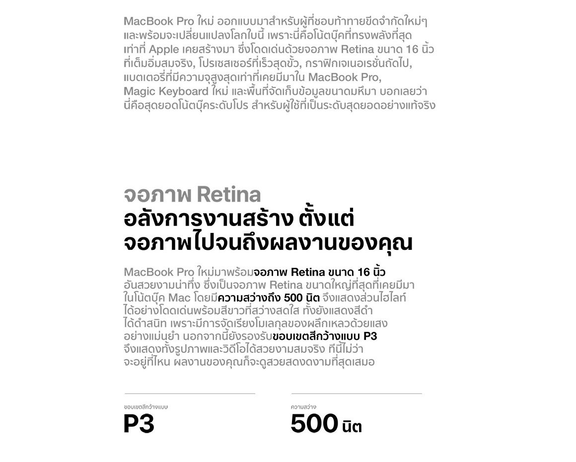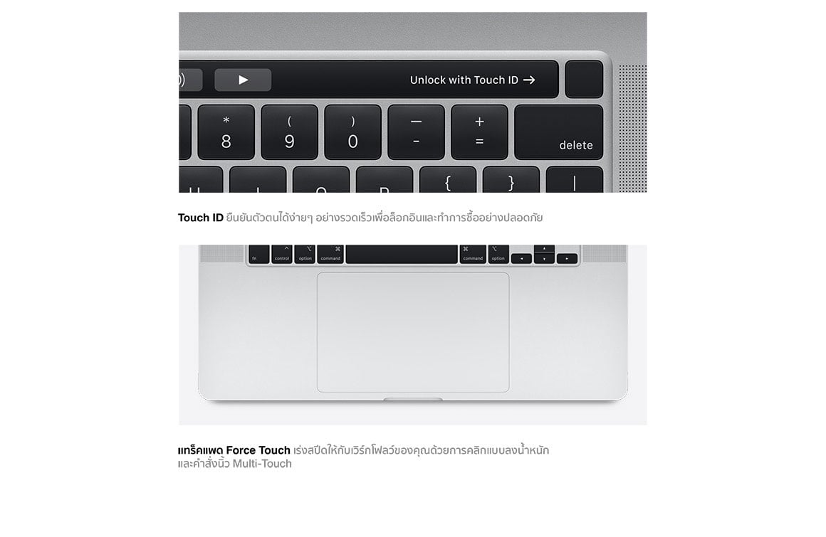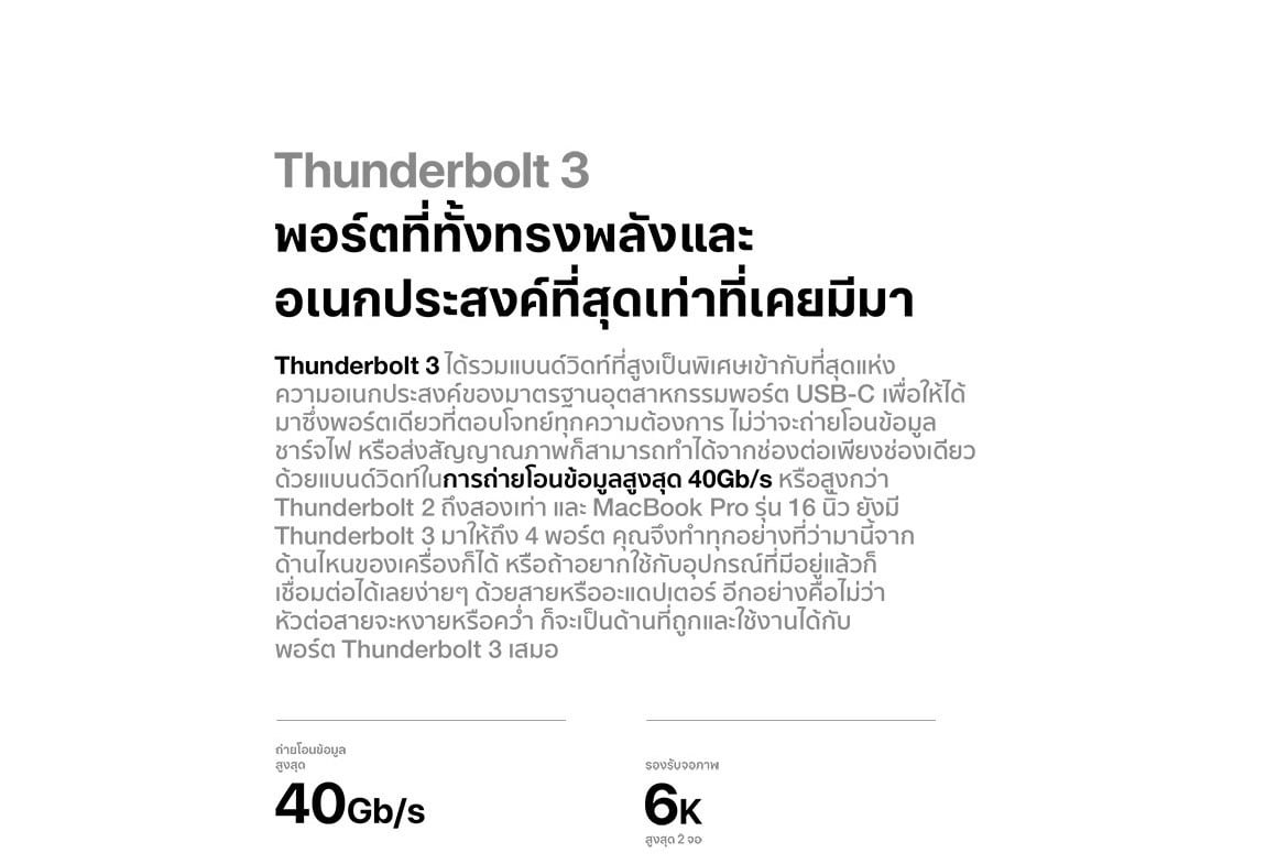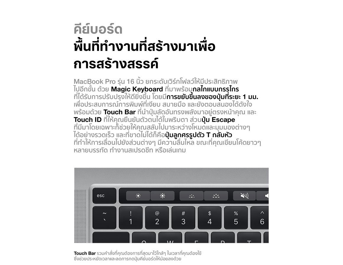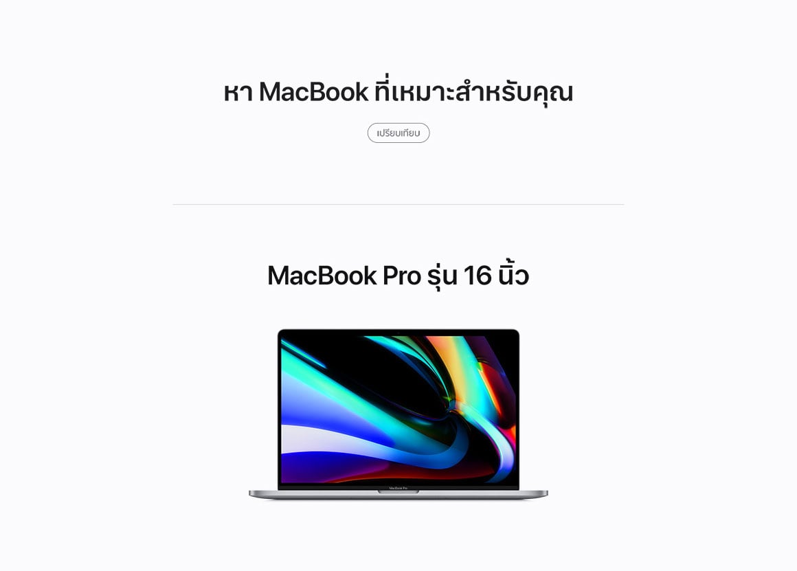 - Apple ทำการทดสอบในเดือนตุลาคม 2019 โดยใช้ระบบของ MacBook Pro 16 นิ้ว รุ่นก่อนการผลิตจริงที่มี Intel Core i9 แบบ 8-core ความเร็ว 2.3GHz พร้อม RAM ขนาด 16GB และ SSD ความจุ 1TB การทดสอบการท่องเว็บผ่านระบบไร้สายวัดระยะเวลาการใช้งานของแบตเตอรี่โดยการเข้าดูเว็บไซต์ซึ่งเป็นที่นิยม 25 ไซต์ผ่านระบบไร้สาย ขณะตั้งค่าความสว่างหน้าจออยู่ในระดับที่ 12 จากล่างสุด หรือ 75% การทดสอบการเล่นภาพยนตร์ในแอพ Apple TV วัดระยะเวลาการใช้งานของแบตเตอรี่โดยการเล่นภาพยนตร์ HD 1080p ขณะตั้งค่าความสว่างหน้าจออยู่ในระดับที่ 12 จากล่างสุด หรือ 75% การทดสอบระยะเวลาสแตนด์บายวัดระยะเวลาการใช้งานของแบตเตอรี่โดยการเชื่อมต่อเครือข่ายไร้สายและลงชื่อเข้าใช้บัญชี iCloud เพื่อเข้าสู่โหมดสแตนด์บายขณะที่แอพพลิเคชั่น Safari และเมลเปิดอยู่ และคงการตั้งค่าของระบบทั้งหมดไว้ตามค่าเริ่มต้น ระยะเวลาการใช้งานแบตเตอรี่แตกต่างกันไปตามการใช้งานและการกำหนดค่า ดูข้อมูลเพิ่มเติมได้ที่ apple.com/batteries