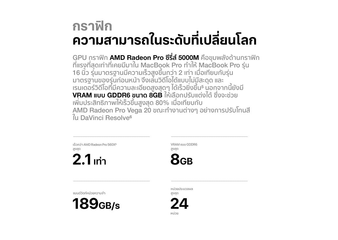 - Apple ทำการทดสอบในเดือนตุลาคม 2019 โดยใช้ระบบของ MacBook Pro 16 นิ้ว รุ่นก่อนการผลิตจริงที่มี Intel Core i9 แบบ 8-core ความเร็ว 2.4GHz พร้อมกราฟิก Radeon Pro 5500M ที่มี VRAM ขนาด 8GB, RAM ขนาด 64GB และ SSD ความจุ 4TB และระบบของ MacBook Pro 15 นิ้ว รุ่นวางจำหน่ายที่มี Intel Core i9 แบบ 8-core ความเร็ว 2.4GHz พร้อมกราฟิก Radeon Pro Vega 20 ที่มี VRAM ขนาด 4GB, RAM ขนาด 32GB และ SSD ความจุ 4TB ทดสอบด้วย DaVinci Resolve Studio 16 โดยใช้เอฟเฟ็กต์ทั่วไป 10 แบบ และโปรเจ็กต์ UHD ความยาว 10 วินาที ความละเอียด 3840 x 2160 ที่ 24 เฟรมต่อวินาที การทดสอบประสิทธิภาพดำเนินการโดยใช้ระบบคอมพิวเตอร์เฉพาะ และแสดงให้เห็นถึงประสิทธิภาพอย่างคร่าวๆ ของ MacBook Pro