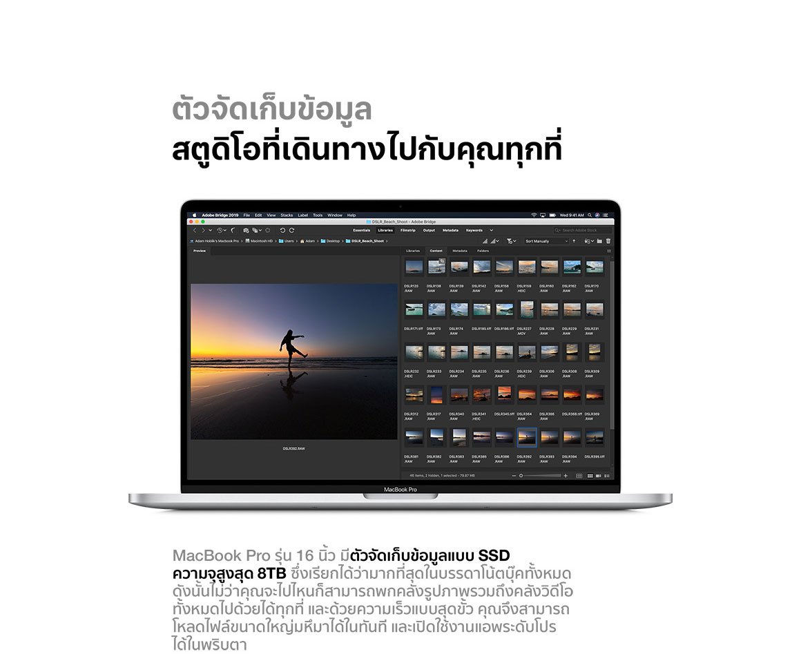 - Apple ทำการทดสอบในเดือนตุลาคม 2019 โดยใช้ระบบของ MacBook Pro 16 นิ้ว รุ่นก่อนการผลิตจริงที่มี Intel Core i9 แบบ 8-core ความเร็ว 2.4GHz พร้อม RAM ขนาด 64GB, ระบบของ MacBook Pro 16 นิ้ว รุ่นก่อนการผลิตจริงที่มี Intel Core i9 แบบ 8-core ความเร็ว 2.4GHz พร้อม RAM ขนาด 32GB และระบบของ MacBook Pro 16 นิ้ว รุ่นก่อนการผลิตจริงที่มี Intel Core i9 แบบ 8-core ความเร็ว 2.3GHz พร้อม RAM ขนาด 16GB, Adobe Photoshop 2020 21.0.0 รุ่นก่อนเปิดให้ใช้งานจริงได้รับการทดสอบโดยใช้ไฟล์ขนาด 12.5GB และใช้ฟังก์ชั่น Rotate, Unsharp Mask, Auto Color และ Scale การทดสอบประสิทธิภาพดำเนินการโดยใช้ระบบคอมพิวเตอร์เฉพาะ และแสดงให้เห็นถึงประสิทธิภาพอย่างคร่าวๆ ของ MacBook Pro