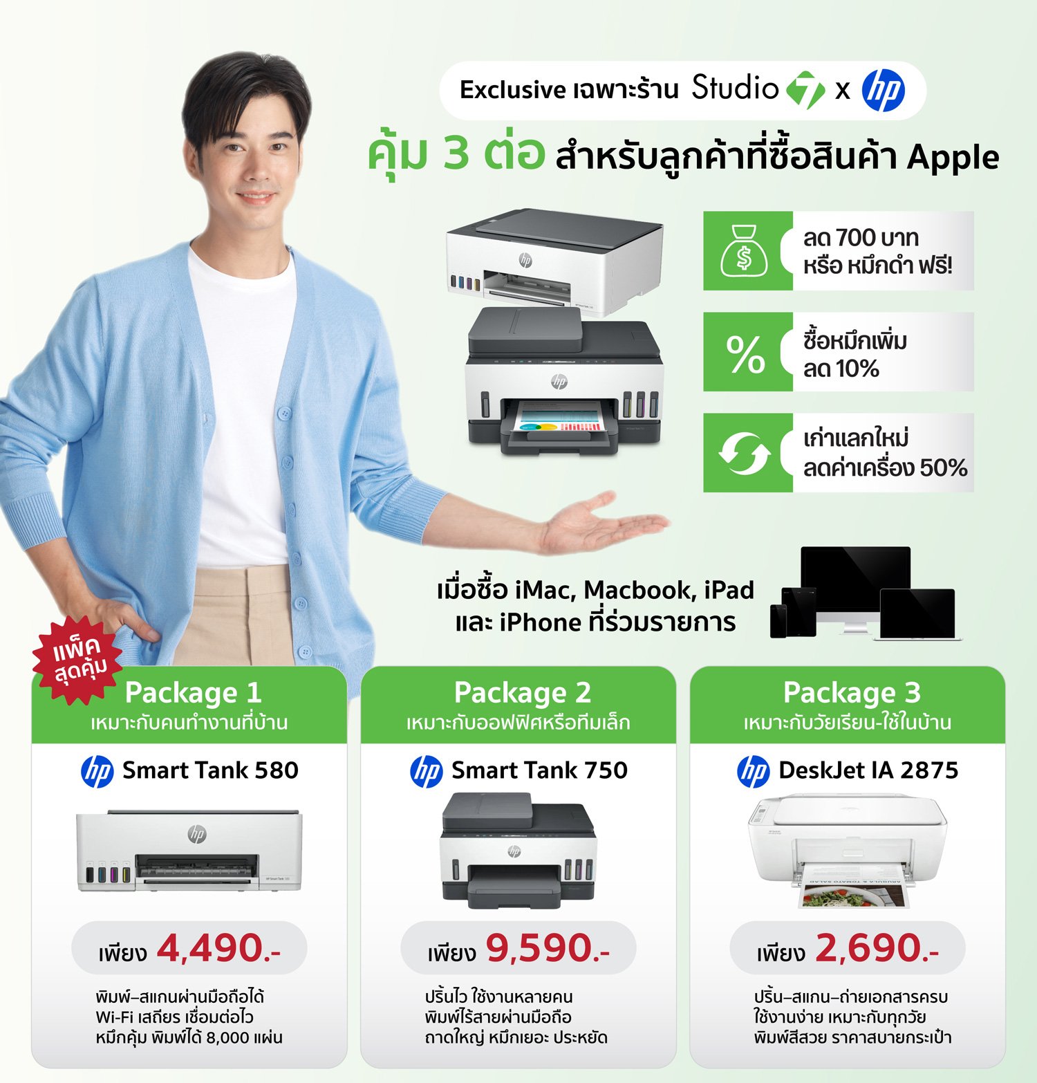 เมื่อซื้อสินค้า iMac, MacBook, iPad หรือ iPhone รุ่นใดก็ได้ภายในร้าน Studio 7 รับสิทธิ์ซื้อเครื่องปริ้น HP Printer ถูกที่สุดและคุ้ม 3 ต่อ* ที่ตอบโจทย์ทั้งนักเรียน นักศึกษา และคนทำงานทุกอาชีพ ใช้งานเข้ากับ Apple Ecosystem ได้อย่างลงตัว