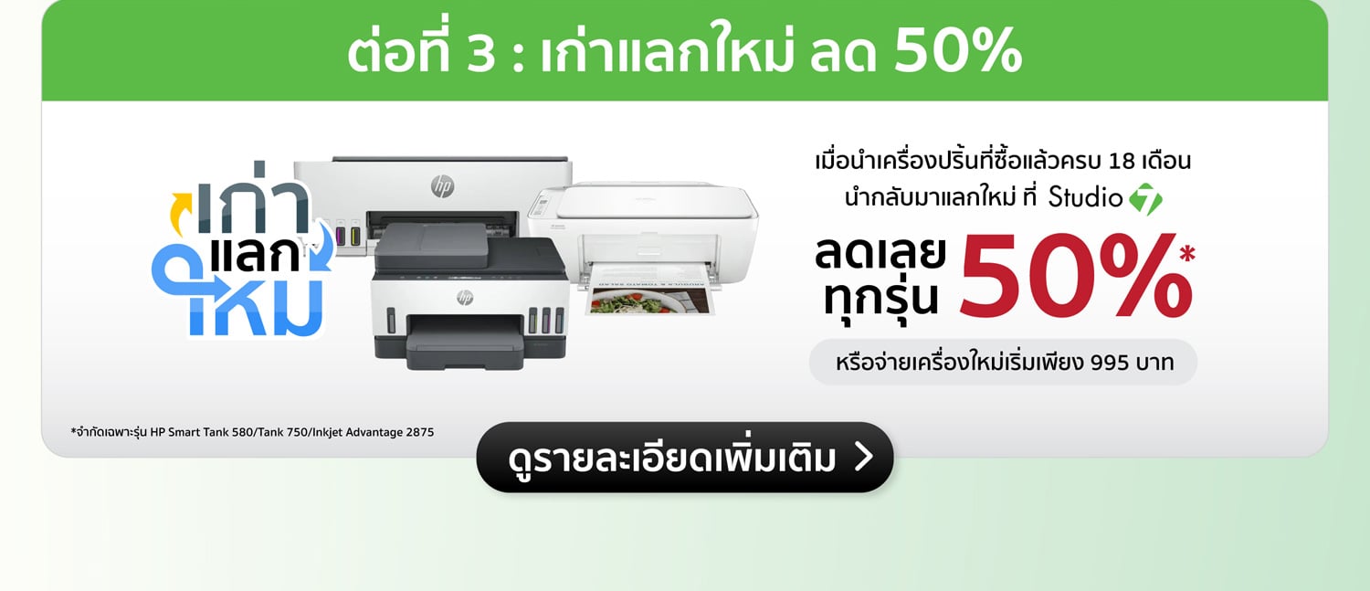 ทั้ง 3 Package เมื่อใช้งานครบ 18 เดือน สามารถนำเครื่องปริ้นเก่ามาแลกซื้อเครื่องใหม่ที่ Studio 7 รับส่วนลดทันที 50% หรือจ่ายเครื่องใหม่เริ่มเพียง 995 บาท สำหรับเครื่องปริ้น HP รุ่นใหม่