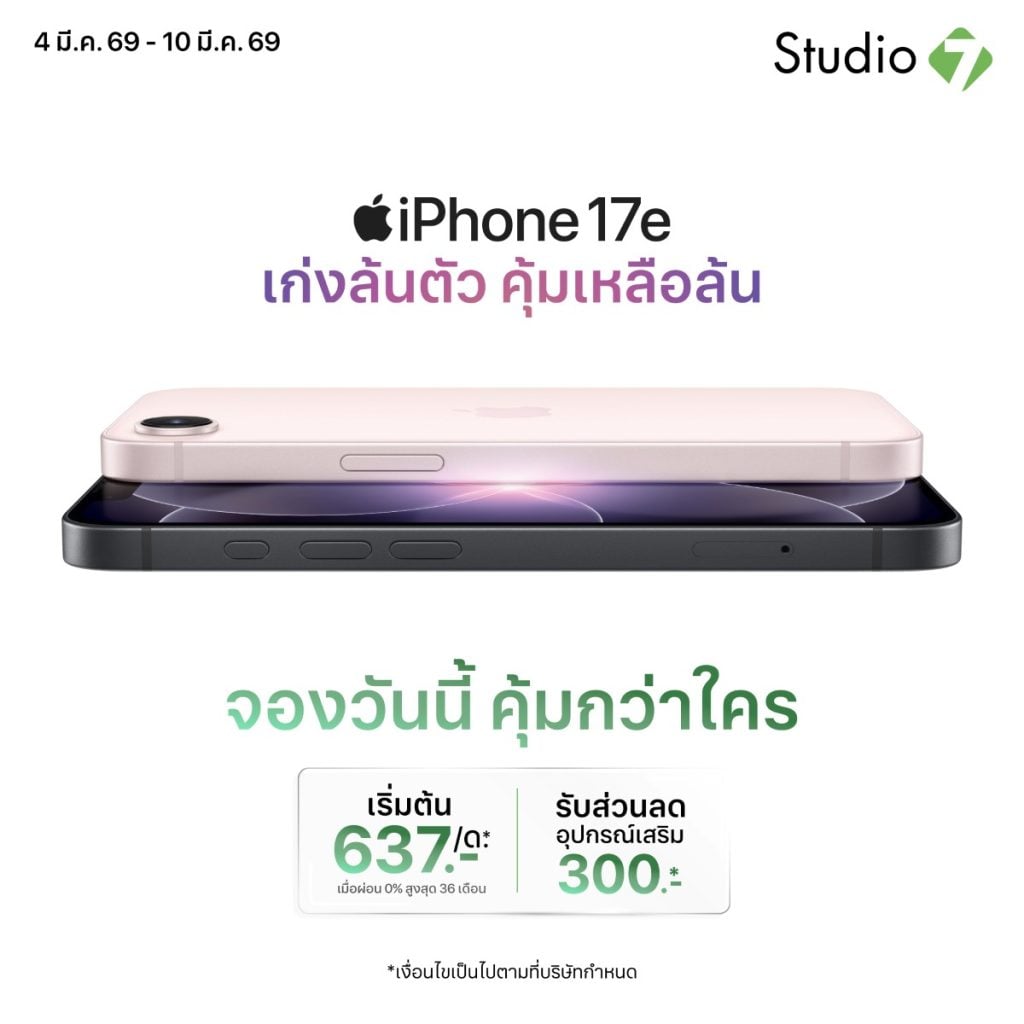 โปรโมชันจอง iPhone 17e ตั้งแต่วันที่ 4 – 10 มี.ค. 69 ที่ Studio7 ทุกสาขา หรอจองออนไลน์ studio7thailand.com