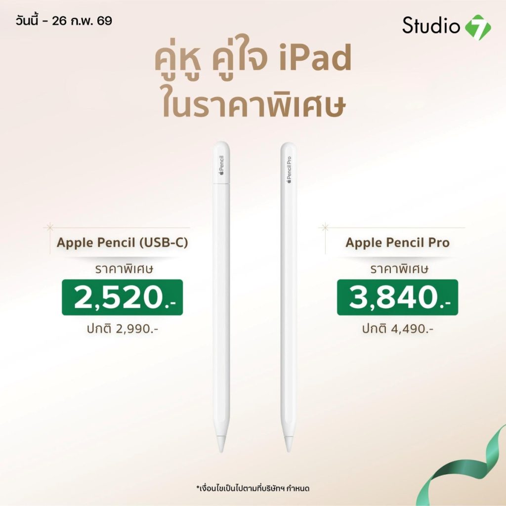 โปรโมชันตั้งแต่วันนี้ – 26 ก.พ. 69 ที่ Studio 7 ทุกสาขา หรือ ซื้อ Apple Pencil ออนไลน์ที่ studio7thailand.com คลิก