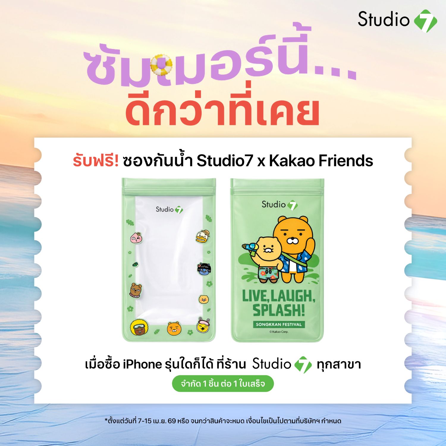 ซื้อ iPhone ที่ Studio7 รับฟรี! ซองกันน้ำลาย Kakao Friends ทันที โปรโมชันวันที่ 7 – 15 เม.ย. 69 นี้ ทุกสาขา
