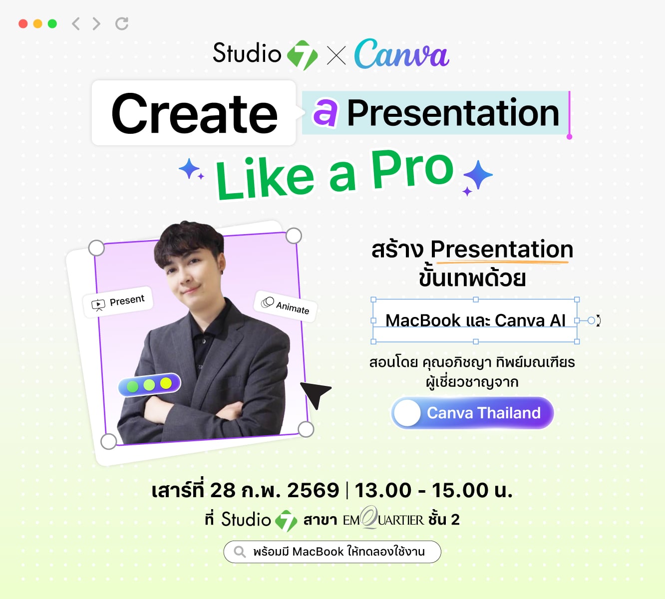 เวิร์กชอปสอนสร้าง Presentation ขั้นเทพด้วย MacBook และ Canva AI มาอัปสกิลพรีเซนต์งานให้ดูโปร ✨ เรียนรู้การใช้ MacBook ร่วมกับฟีเจอร์ใหม่ล่าสุดของ Canva AI 2026 เพื่อสร้างสรรค์ Presentation ระดับมืออาชีพ ที่ทั้งสวย ชัด และสื่อสารได้อย่างมีประสิทธิภาพ